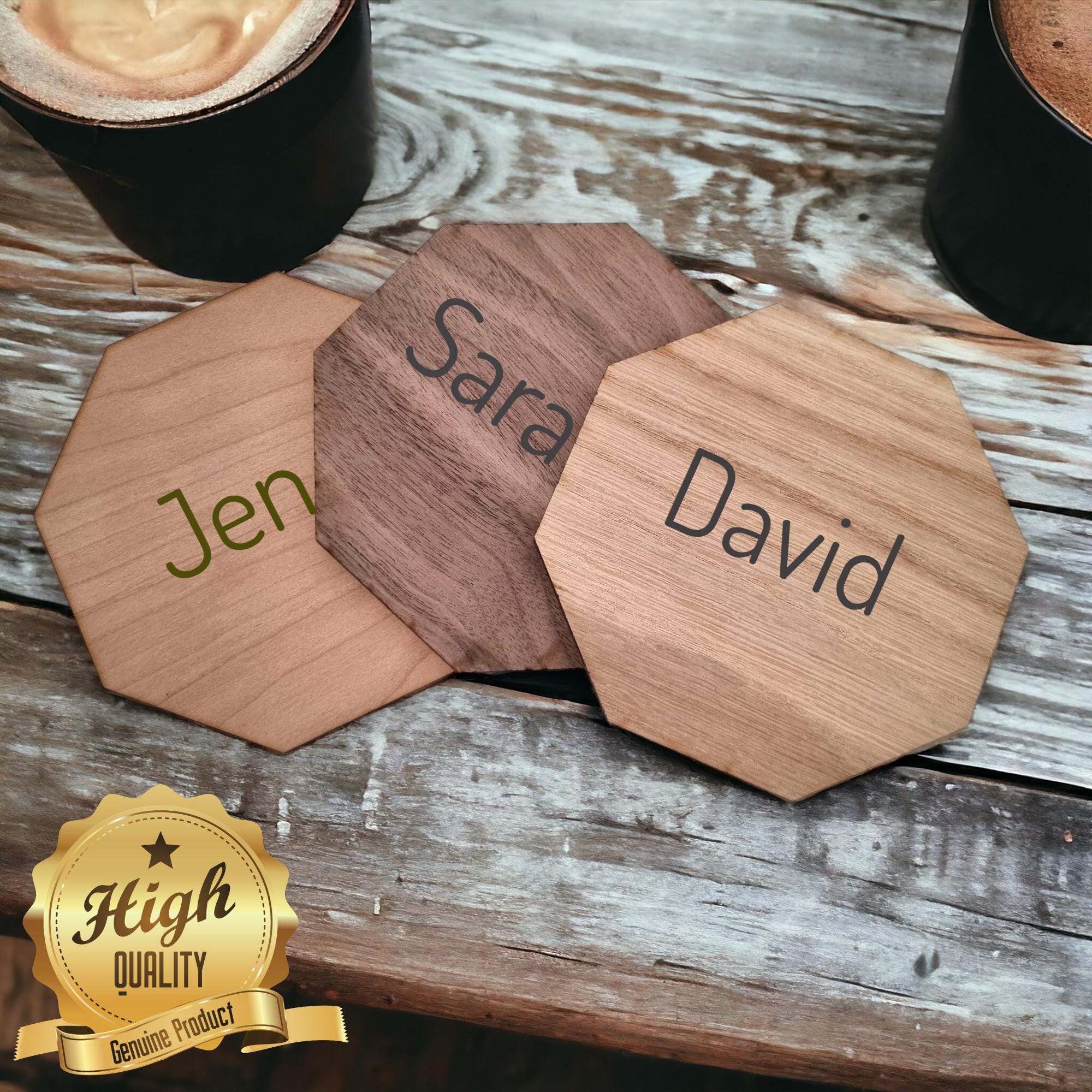 Wooden veneeered coasters, with anti-slip silicon feet.