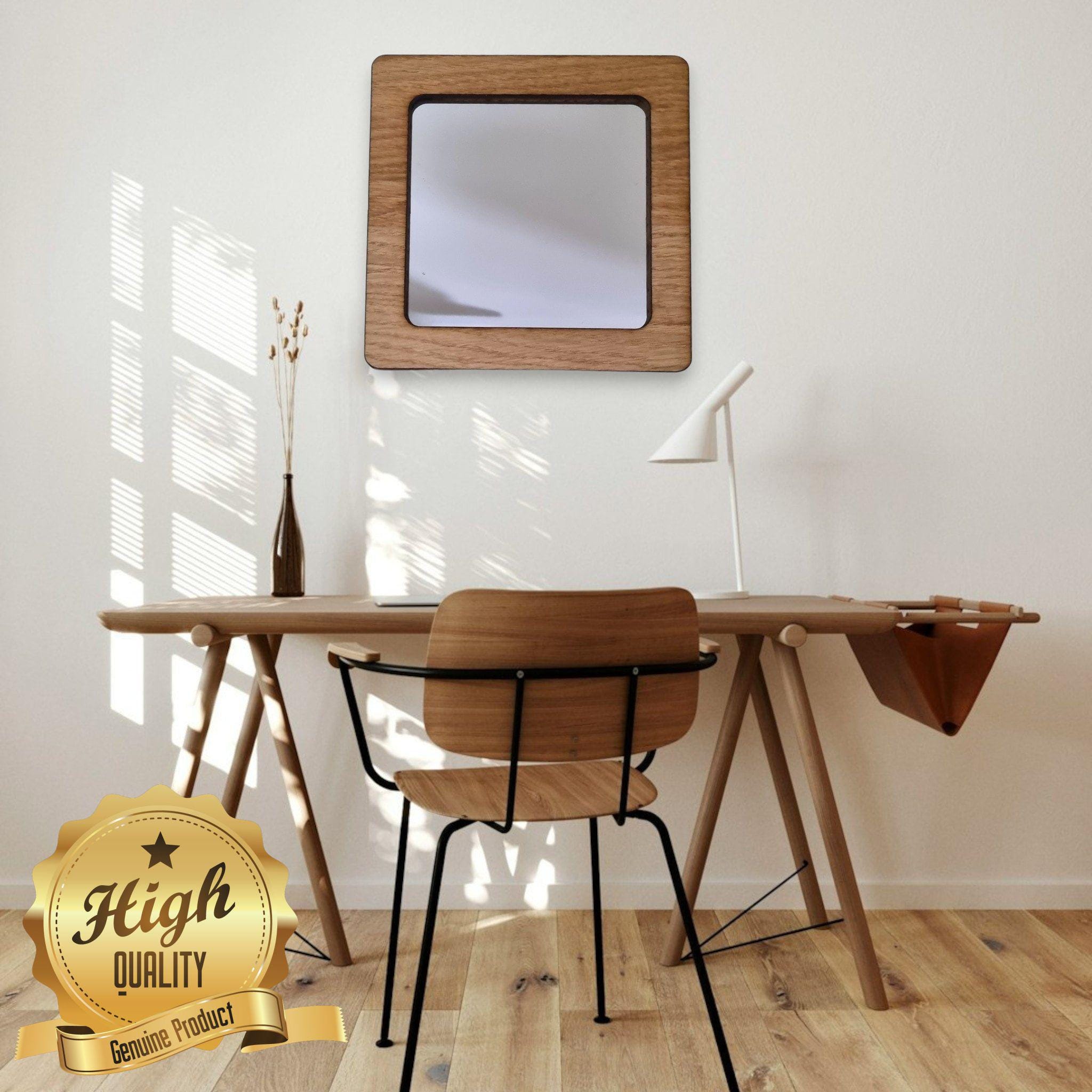 Our mirrors are made from shatterproof acrylic mirror and have laser polished edges. The frame is made from Oak, walnut or cherry veneer of your choice, we provide hooks for the back for hanging on a nail or with string.