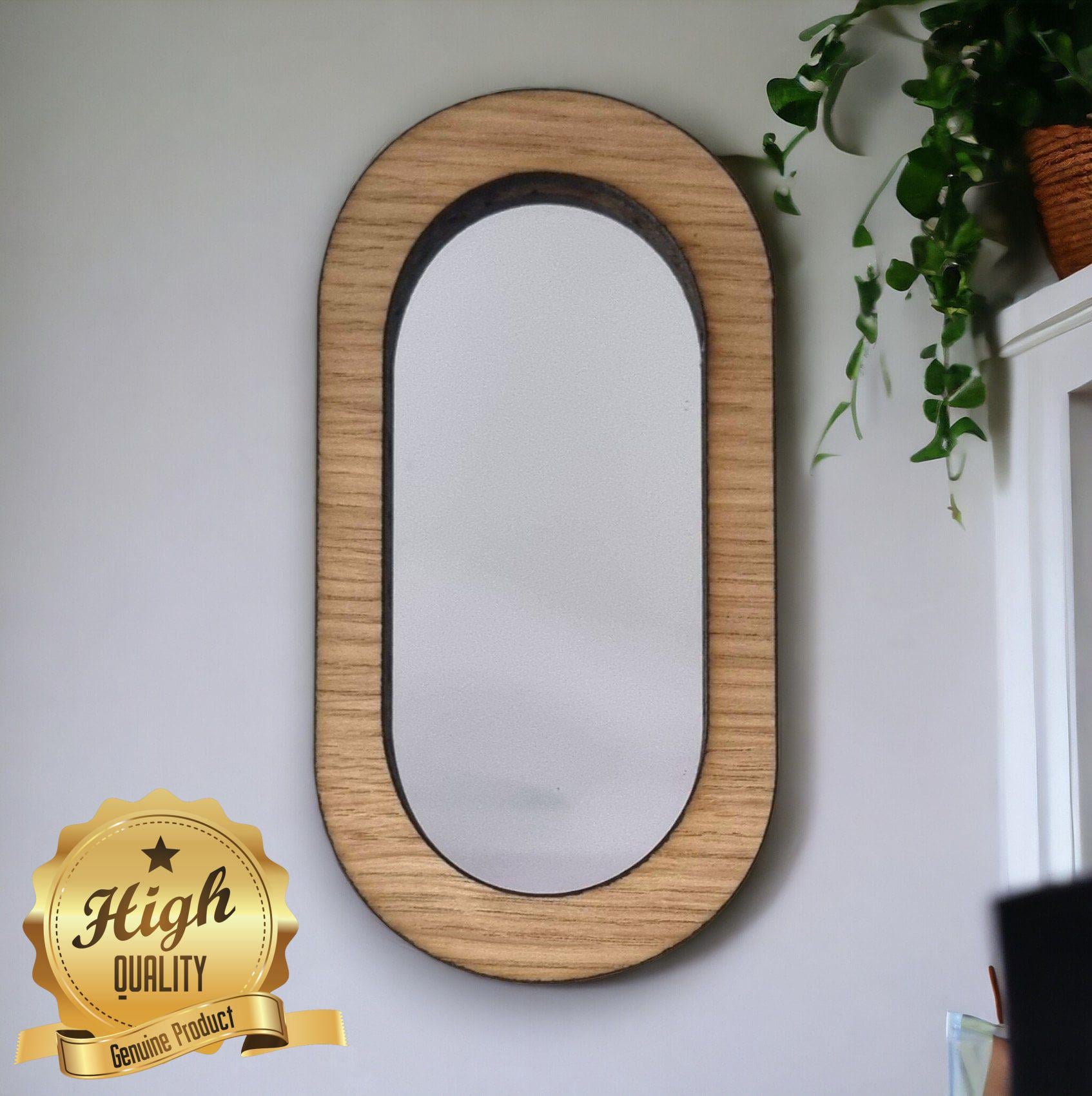 Our mirrors are made from shatterproof acrylic mirror and have laser polished edges. The frame is made from Oak, Walnut or Cherry veneer of your choice, we provide hooks for you to stick on and hang which ever way you prefer.