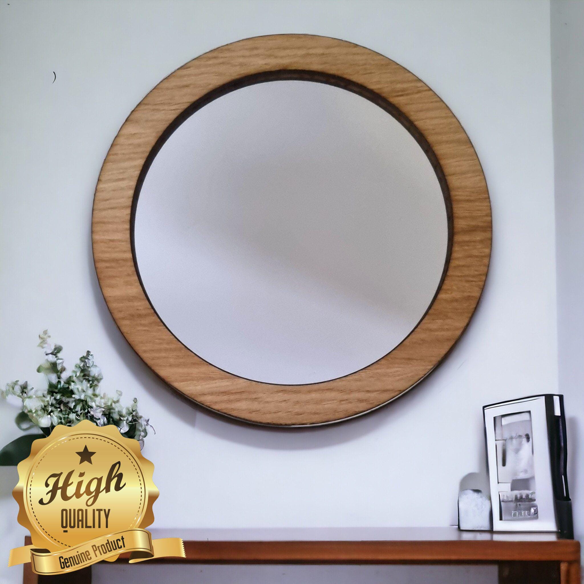 Our mirrors are made from shatterproof acrylic mirror and have laser polished edges. The frame is made from Oak, walnut or cherry veneer of your choice, we provide hooks for the back for hanging on a nail or with string.