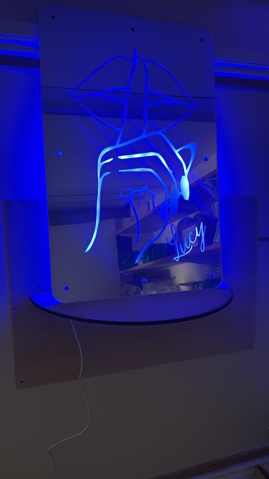Our Bespoke Customised Your Name or Phrase sign is made from top quality safety acrylic mirror, and is etched with the name or phrase or logo you would like, it comes with the fixings and led back panel that has a long lead, so can reach to a laptop or plug, it comes with a remote control for changing the lights to one colour, or flicker through the colours as desired. Also backs up as a great mirror. This sign is made especially for you it comes with the led lights fitted and a 1.5m long usb lead.