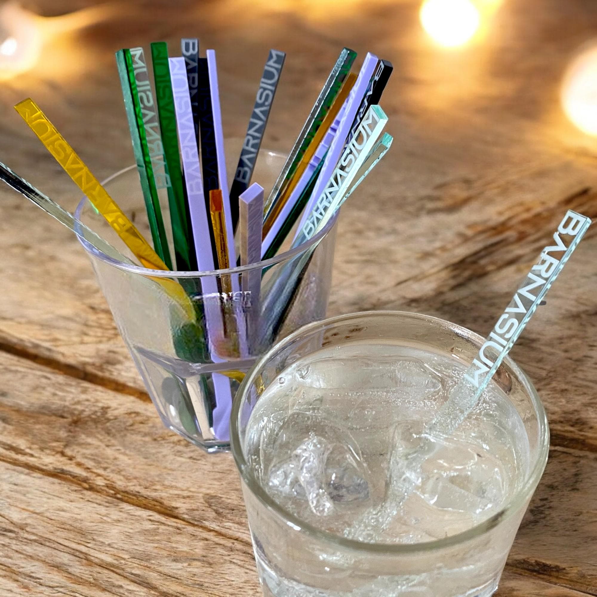 Acrylic drinks stirrers, which can be washed and reused.